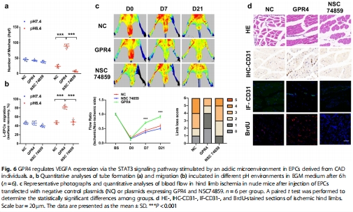 siRNA敲低:敲低GPR4使健康人EPCs在pH 6.4時成管能力↓45%,p-STAT3/VEGFA↓(圖3f-g, 圖5c-d)。