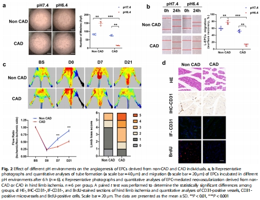 臨床樣本分析:分離健康人(非CAD組)和CAD患者的EPCs,比較酸性環境(pH 6.4 vs 7.4)下血管生成能力(圖2);