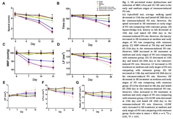 階段特異性保護:HS僅在PD早期(0天)和中期(7天)階段顯著改善心血管功能障礙(平均動脈壓↑、心率變異性↑)和運動癥狀(行走速度↑、平衡能力↑),但對晚期(14天)無效(圖1)。