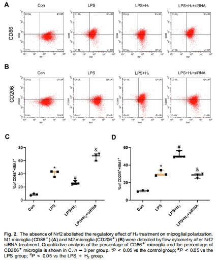 H?促進小膠質細胞從促炎M1型(CD86?)向抗炎M2型(CD206?)極化(圖2, 圖6)。
