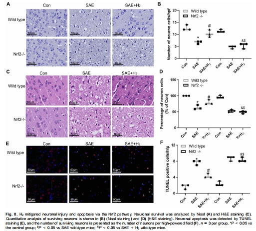神經保護與認知改善:H?降低神經元凋亡,改善SAE認知功能障礙,且所有效應均依賴Nrf2。