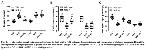 H?使SAE小鼠逃避潛伏期↓40%(圖9A),平臺穿越次數↑2.5倍(圖9B)。
