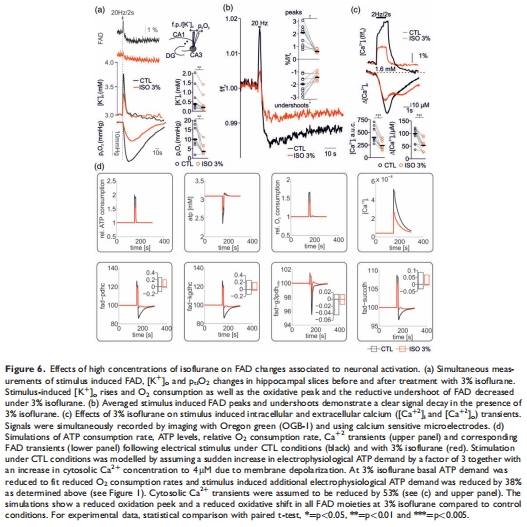 線粒體功能:異氟醚誘導黃素腺嘌呤二核苷酸(FAD)還原性偏移(熒光衰減加速至4.3% vs. 1.7%,p=0.03),但計算模型預測其源于突觸抑制而非直接線粒體抑制(圖5)。