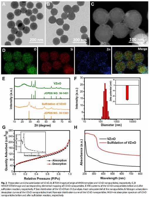 VZnO的構建與功能:以病毒樣介孔二氧化硅(VMSN)為載體的氧化鋅納米球(圖2A-D),通過反應 ZnO+HX2S
