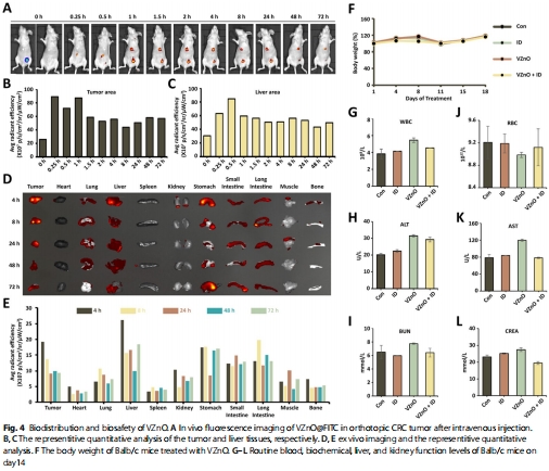 VZnO@FITC在CRC瘤內富集(4h達峰)(圖4A-C);