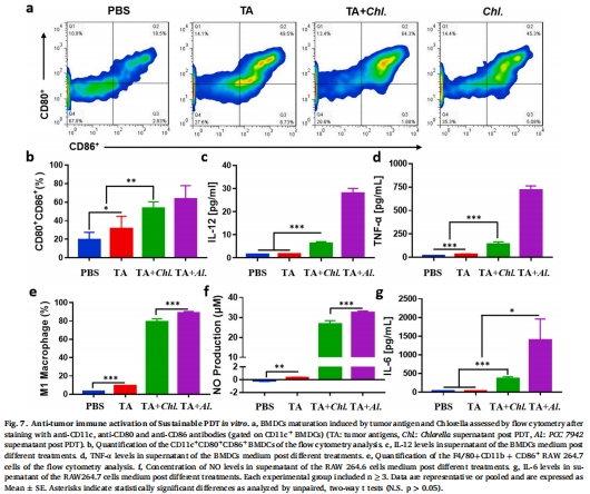 免疫激活:PDT處理的小球藻上清液促進DC成熟(CD80/CD86↑)及炎癥因子分泌(IL-12/TNF-α↑)(圖7)。