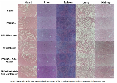 協同抑瘤:"C-Gel + PFC-NPs + 雙光照射"組腫瘤體積抑制90%(圖6c)。