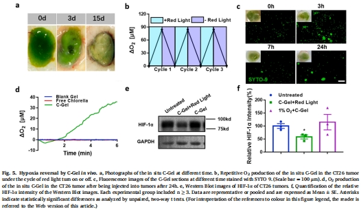 小球藻凝膠(C-Gel)在紅光(600–700 nm)照射下持續產氧,逆轉腫瘤缺氧(圖2d,e);