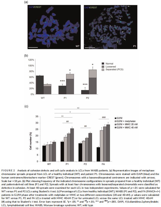 基因組不穩定性:細胞對絲裂霉素C(MMC)敏感,G2/M期阻滯增加,染色體凝聚力缺陷(鐵路染色體)。
