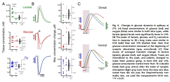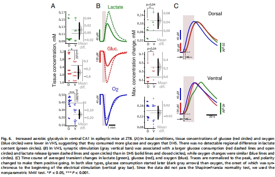VH低代謝:基礎葡萄糖↑0.7mM、乳酸↓110μM vs 健康(圖4A)→ 癲癇腹側糖酵解抑制。