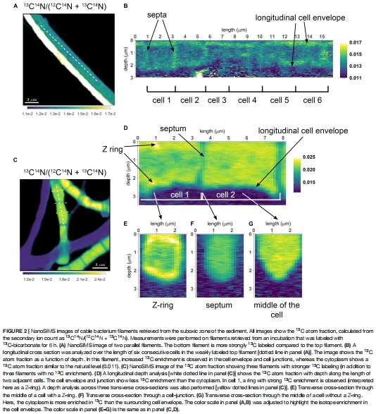 本研究通過結(jié)合雙標(biāo)記穩(wěn)定同位素探測(13C和1?N)、納米二次離子質(zhì)譜(nanoSIMS)、熒光顯微鏡和基因組分析,揭示了電纜細(xì)菌(cable bacteria)獨(dú)特的細(xì)胞周期與生長機(jī)制: