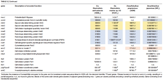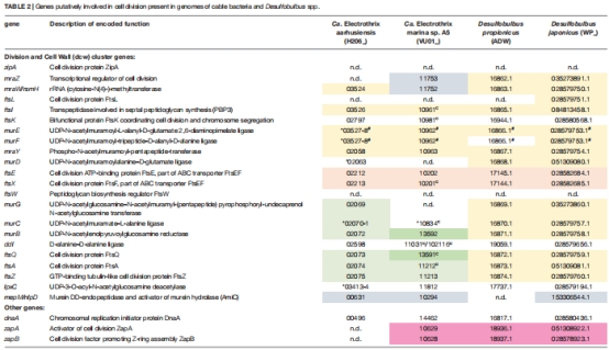 基因組尺度:比對電纜細(xì)菌與近緣菌(Desulfobulbus)的細(xì)胞分裂基因簇(表2)。