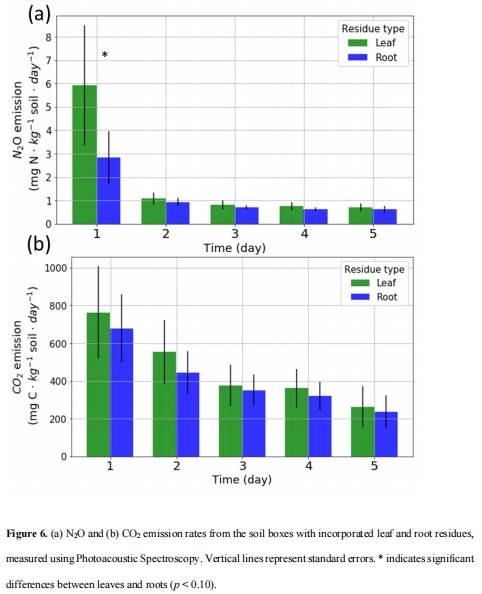 時(shí)間動(dòng)態(tài):柳枝稷葉和根殘?bào)w附近N?O在濕潤后0-12小時(shí)內(nèi)開始產(chǎn)生,葉殘?bào)w峰值更高(約0.6天達(dá)峰),但根殘?bào)w啟動(dòng)更快(0.41天 vs 葉0.92天)(圖5)。