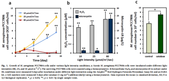 數據:高光照(80 μmol m?2 s?1)導致無菌藻死亡(細胞計數下降),伴隨H?O?積累(0.8 μM)和微囊藻毒素釋放(14倍增加)(圖1b)。