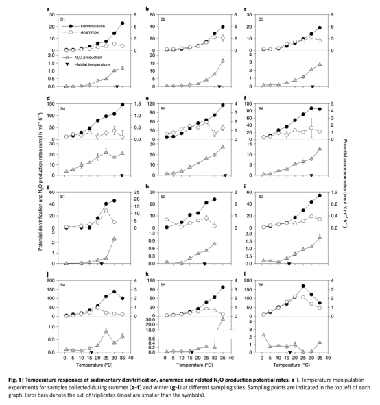 摘要指出溫度是控制沉積物中微生物介導的反硝化(denitrification)和厭氧氨氧化(anammox)的關鍵環境變量。反硝化過程會產生溫室氣體N?O,而厭氧氨氧化則不會。研究通過亞熱帶沉積物的溫度梯度實驗發現: