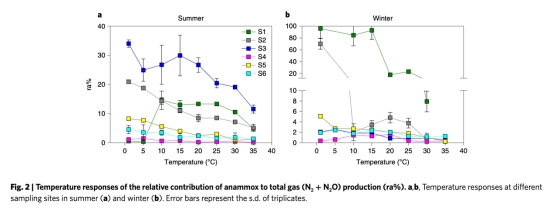 ? 意義:ra%普遍隨溫度升高而降低(夏季平均7%→冬季5%),表明變暖抑制厭氧氨氧化的相對作用。