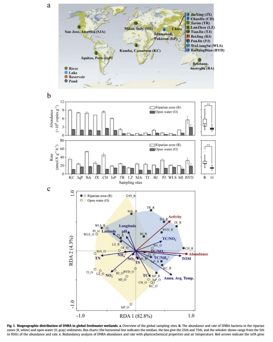 1. 全球尺度驗證:采集6大洲15個濕地30個沉積物樣本(河岸帶與開闊水域對比),通過qPCR和高通量測序分析nrfA基因豐度與群落結構(圖1a)。