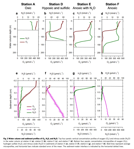 ? 微米級(jí)垂直剖面揭示O?、H?S、N?O的耦合關(guān)系(圖2e-h),如E站N?O峰值(471 nmol L?1)與H?S氧化區(qū)的重疊