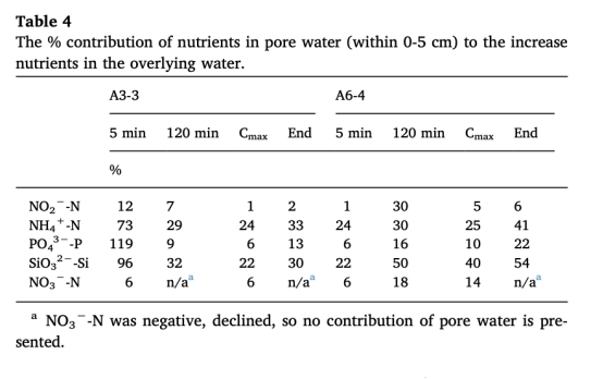 ? 數據:PO?3?-P釋放量0.9 Mmol/d,NH??-N 51 Mmol/d,SiO?2?-Si 42 Mmol/d;孔隙水貢獻僅占PO?3?-P釋放的13-22%(表4)。