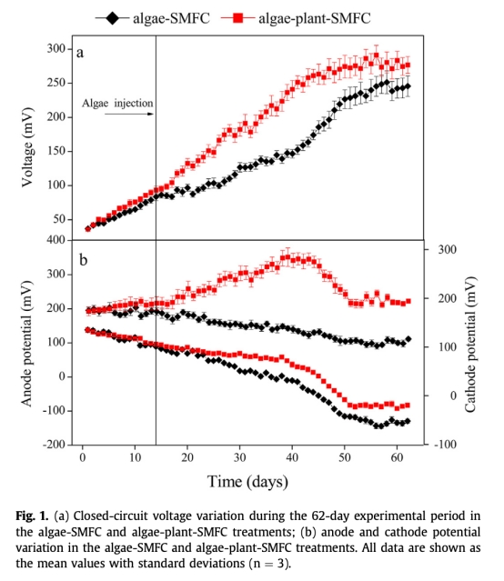 ? 意義:量化SMFC產(chǎn)電性能,揭示黑藻通過(guò)維持高陰極電位提升產(chǎn)電(平均電壓181.4 mV vs 137.7 mV),且與藻分解階段相關(guān)