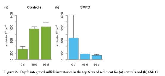 ? 研究意義:證實SMFCs使硫化物在陽極深度降至0 μM(圖4b);深度積分庫存顯示SMFCs組硫化物僅為對照組20%(圖7)