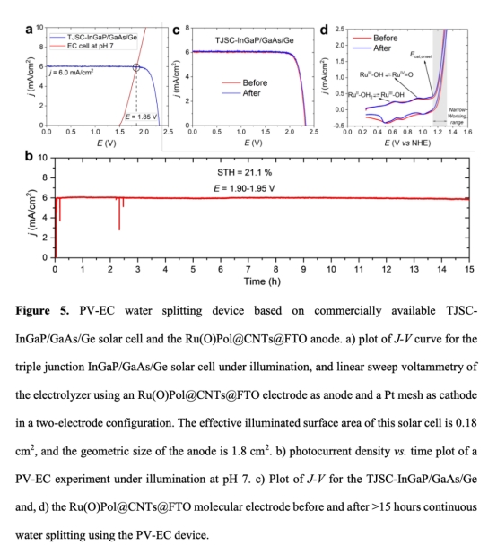2. 構建高性能PV-EC系統,實現溫和條件下(pH 7, 1 sun)的太陽能-氫能高效轉化