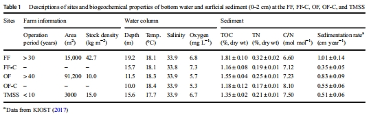論文揭示韓國統營海域魚類網箱養殖(FF)和牡蠣延繩養殖(OF)顯著增加沉積物耗氧量(SOD)和底棲營養鹽通量(BNF),導致沉積物有機質(OM)富集并引發局部富營養化。關鍵結論包括: