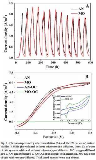 微氧系統(MO)電流密度穩定在4±0.2 A/m2,顯著高于厭氧系統(AN)(圖1A);