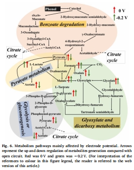 正電位(0~0.4 V)上調四條關鍵代謝途徑:苯甲酸CoA連接降解、丙酮酸代謝、乙醛酸-二羧酸代謝、糖酵解/糖異生(圖5);