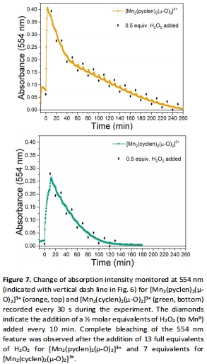 原位UV-Vis證實(shí)[Mn???-(μ-O)?-Mn??]3?二聚體在pyclen體系中可耐受13當(dāng)量H?O?(cyclen僅7當(dāng)量),對(duì)應(yīng)圖7吸光度衰減曲線;