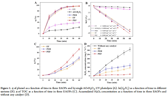 PEF系統(tǒng)60分鐘TOC去除率92±4%(vs. EF系統(tǒng)57±5%),證實紫外光協(xié)同提升礦化效率(圖1C);