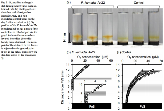 An22在O?<4 μM區域生長,形成致密Fe氧化物帶(圖2a),伴生陡峭O?梯度(斜率突變)(圖2b)。