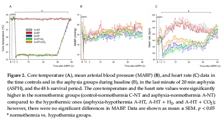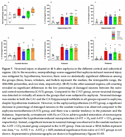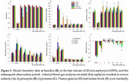 對照組(C-NT)、窒息+常溫(A-NT)、窒息+低溫(A-HT)、A-HT+H?、A-HT+CO?(圖1)。