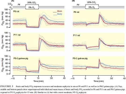 9% O?窒息時,腦PO?迅速恢復至基線甚至更高(大鼠P6/豚鼠),而皮下PO?持續低下(圖2B, 3B)。
