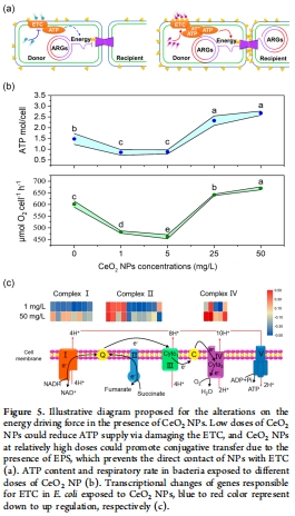 高濃度CeO? NPs(25–50 mg/L):促進ARGs轉移(增加42–53%),機制涉及誘導氧化應激、激活SOS響應、增加EPS合成、提升ATP供應(圖2a, 圖3a, 圖5b)。