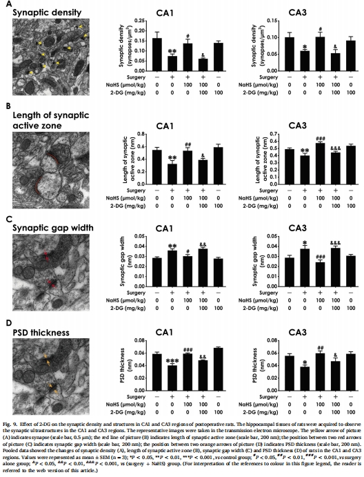 增強突觸可塑性:NaHS提升突觸蛋白(synapsin-1、PSD-95)表達(圖4),改善突觸超微結構(突觸密度↑、活性區長度↑、PSD厚度↑)(圖9)。