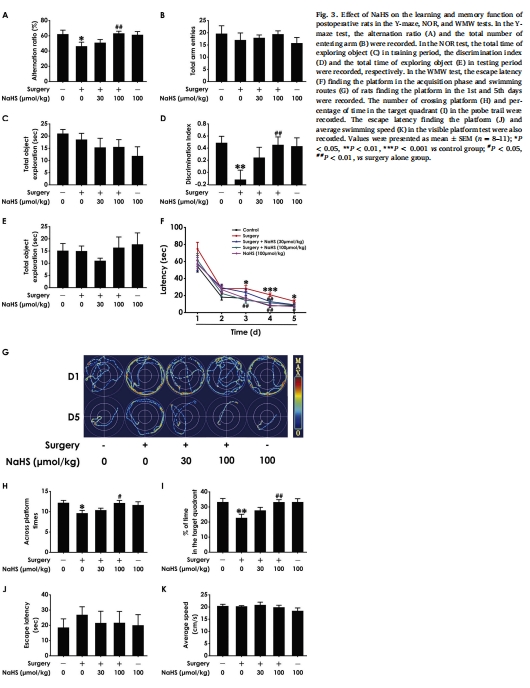 NOR:手術組辨別指數↓(識別記憶受損),NaHS顯著提升(圖3D)。
