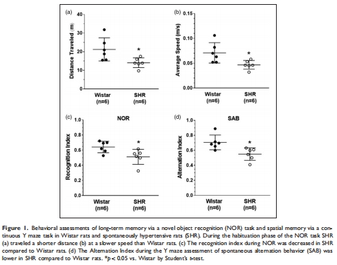 對比SHR與正常血壓Wistar大鼠的長期記憶(NOR任務(wù))和空間記憶(Y迷宮)(圖1);