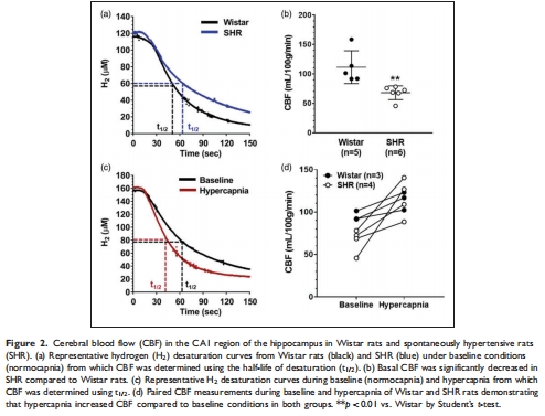 核心發(fā)現(xiàn):自發(fā)性高血壓大鼠(SHR)表現(xiàn)出長期記憶(LTM)和空間記憶障礙(圖1c,d),與海馬基礎(chǔ)血流量顯著降低(68±12 vs. 111±28 mL/100g/min, p<0.01)相關(guān)(圖2b)。