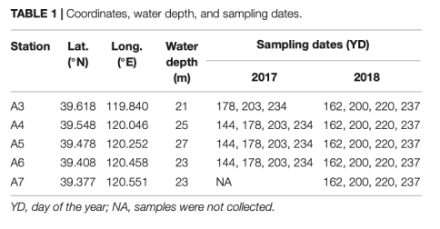 1. 斷面設計:沿渤海北部已知缺氧區設置近岸-離岸斷面(A3-A7站),2017-2018年5-8月每月采樣(圖1,表1)。