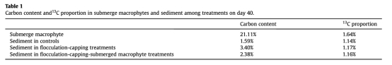 ? 數據:沉水植物吸收13C標記碳(豐度1.64%),沉積物碳含量降至2.38%(絮凝組3.40%)。