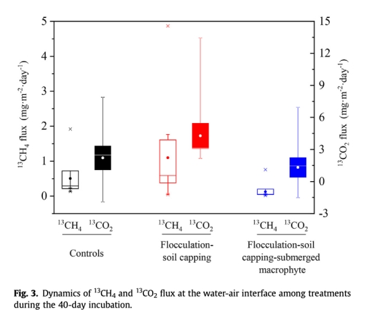 ? 數據:生物泵組CH?平均通量(水-氣界面2.18 mg·m?2·d?1)較絮凝組(7.69 mg·m?2·d?1)降低71.6%;13CH?排放量僅0.08 mg(絮凝組0.56 mg)。