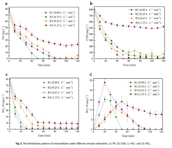 1. 反應(yīng)器設(shè)計(jì):四組連續(xù)曝氣序批式反應(yīng)器(C/N=4.5),對比不同曝氣強(qiáng)度下脫氮效率(圖1-2)。