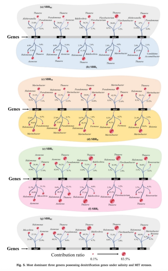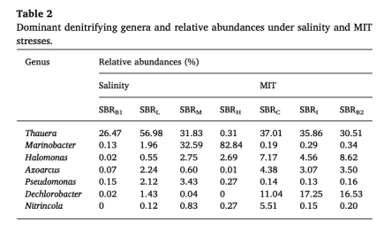 4 微生物群落結構(16S rRNA測序):識別主要反硝化菌屬及其對鹽度和MIT的響應。數據來自表2。