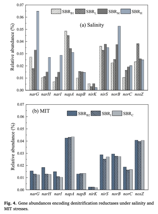 3 揭示高鹽度(40 g/L)下N?O累積機制(Nor和Nos活性顯著下降),為控制溫室氣體排放提供依據。