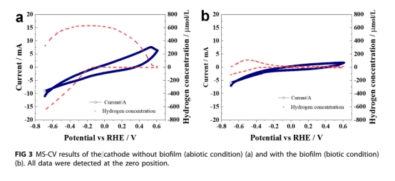 2. 生物膜內的微生物(細菌和古菌)協作消耗了在陰極產生的氫氣。