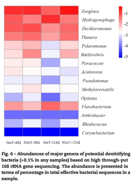4 圖5-6顯示MF-SBR中β-變形菌綱(含Nitrosomonas、Nitrospira)和反硝化菌(如Zoogloea)豐度顯著增加,證實磁場優(yōu)化了菌群結(jié)構(gòu),促進(jìn)脫氮并減少N?O積累。