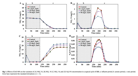 2. N2O排放數(shù)據:氣體N2O排放通量(來自圖1D)。研究意義:表明ZnO NPs降低N2O排放,且與NO2-N積累正相關,揭示NPs對反硝化途徑的影響。
