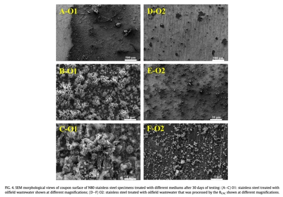 2. 腐蝕速率:來自Fig. 3,N80不銹鋼在處理后廢水中腐蝕速率降低超過兩倍(從0.084 mg·d?1·cm?2降至0.039 mg·d?1·cm?2),意義在于驗證DO去除對腐蝕的抑制作用。