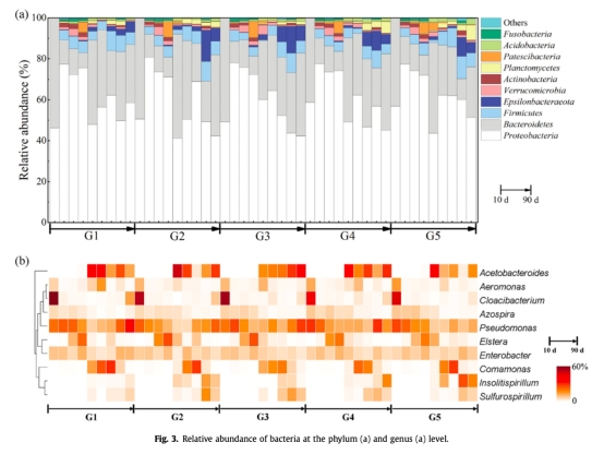2. 細菌群落結構與演替(來自圖3a, b): Proteobacteria(60.39±12.31%)和Bacteroidetes(26.22±13.94%)是絕對優勢門,Pseudomonas(14.47±6.59%)和Enterobacter(6.01±2.01%)是穩定存在的屬。該數據表明灰水SDGS形成了獨特且隨時間演替的微生物生態系統,其中某些關鍵菌屬具有穩定性。